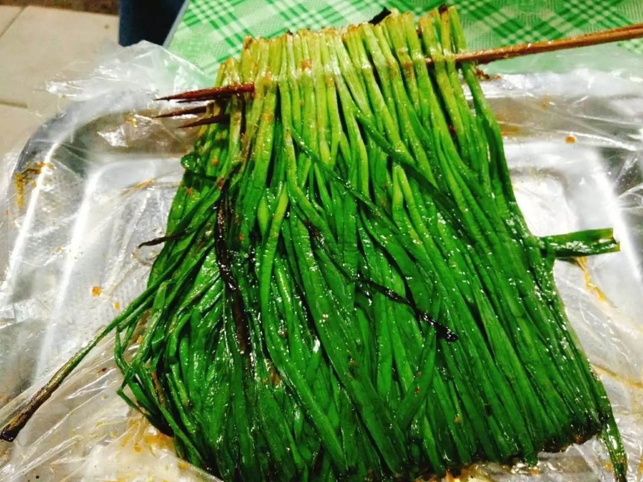 被师傅完全激发出来,韭菜鲜嫩翠绿劲儿,就连烤韭菜也是个技术活,烧烤