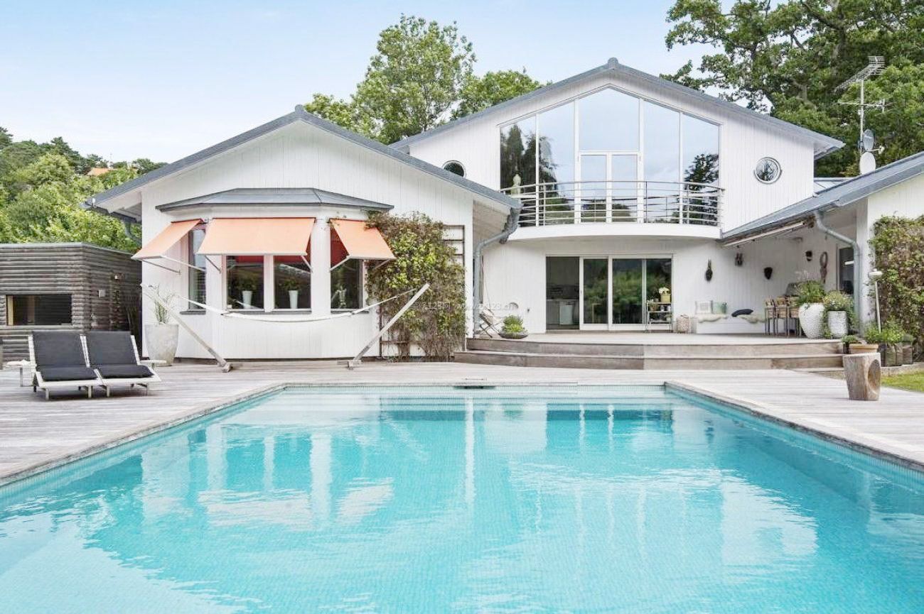 蓝天白云下灰色装修风格的豪宅里的游泳池