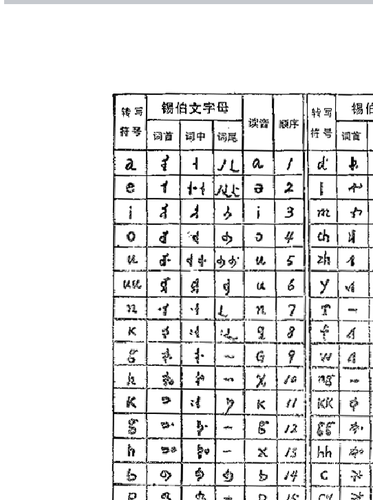 中国蒙族人使用的蒙文字母表~有34个字母~~书写时全竖着~叫回鹤文