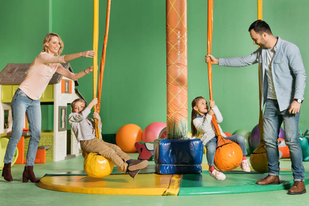 快乐的父母看着孩子在娱乐中心荡秋千照片