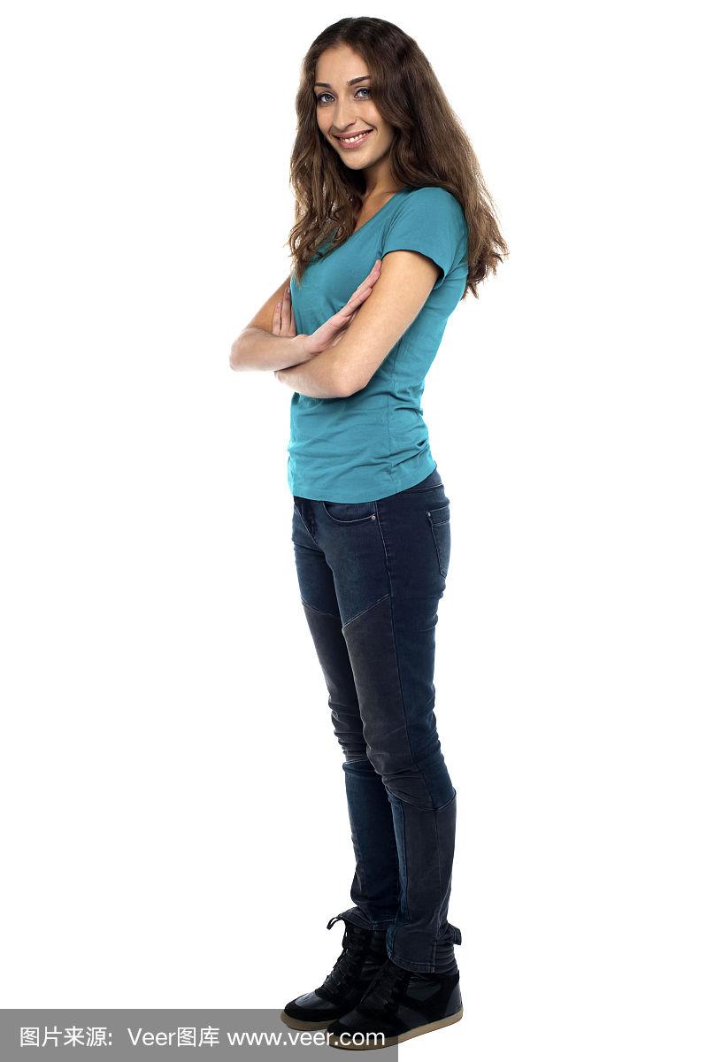 穿黑色单和牛仔裤的黑发女孩的全长肖像.站立姿势, 侧面轮廓.