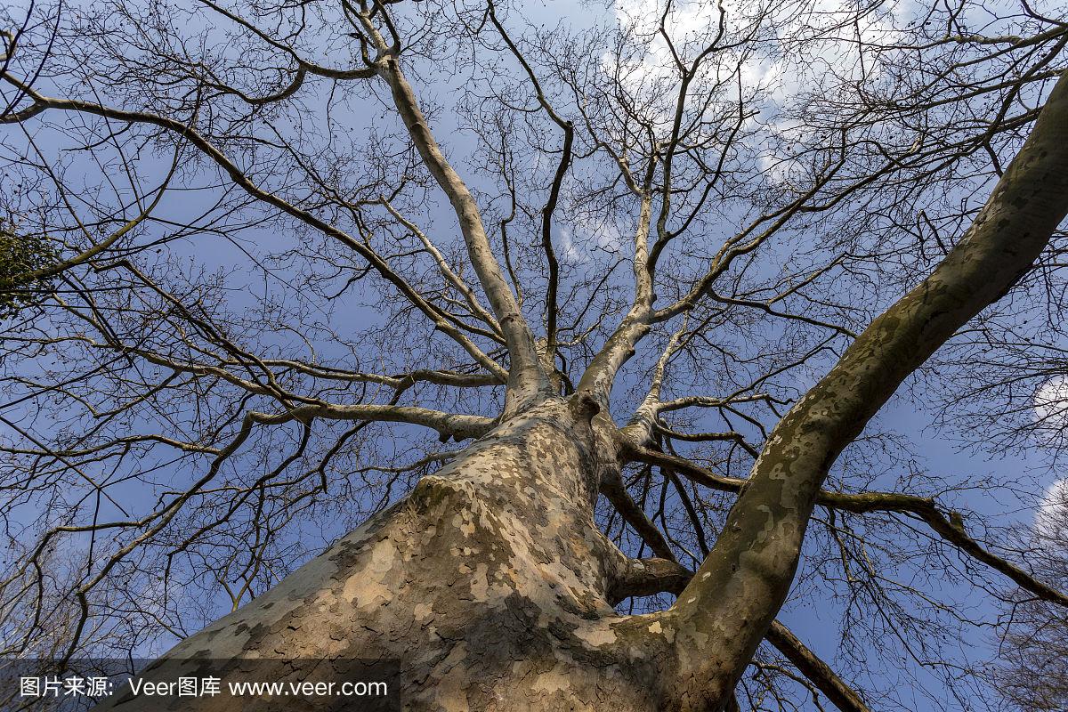 光秃秃的梧桐树树干,有树枝和春天的树叶.