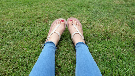 站在绿草背景上的金凉鞋中的脚自拍照片