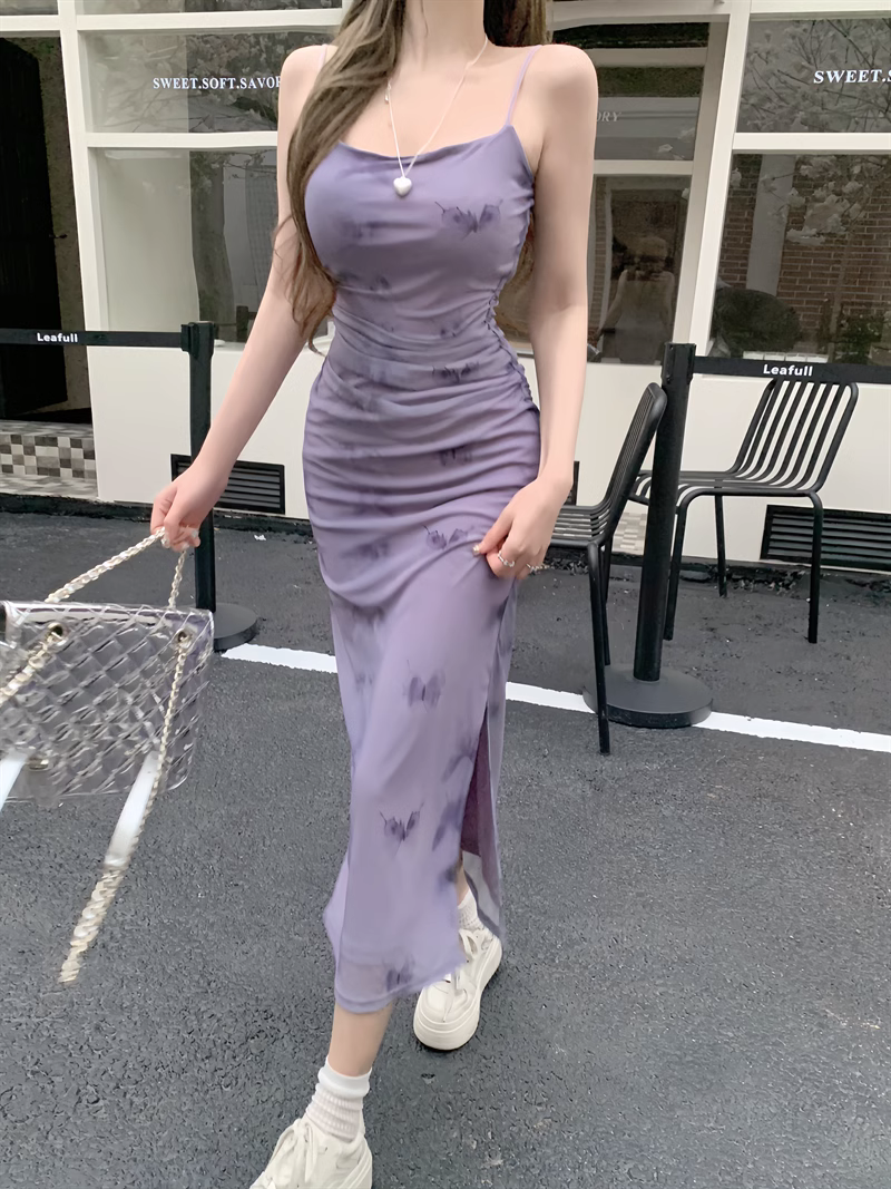 性感紫色收腰印花吊带长裙纯欲气质显瘦网纱褶皱设计感包臂连衣裙