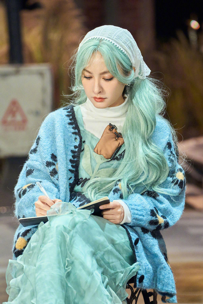 吴昕大侦探造型,绿长发大波浪 同色系雪纺花边裙,宛若绿色精灵