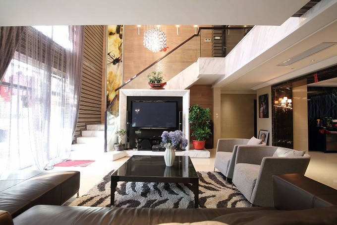 电视墙悬浮于楼梯上,不仅增大客厅的空间感,而且为楼梯的安全护航.