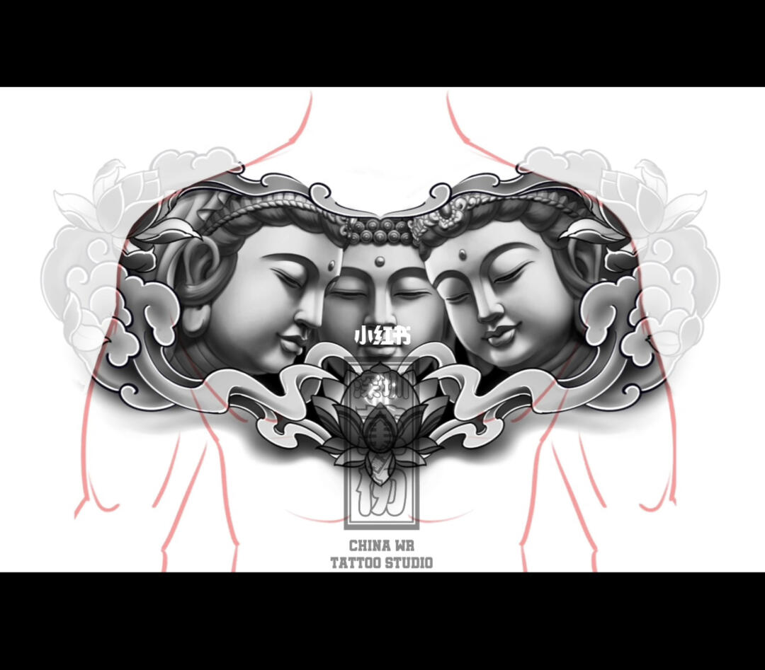 适合花胸的胸前三面佛纹身手稿图片