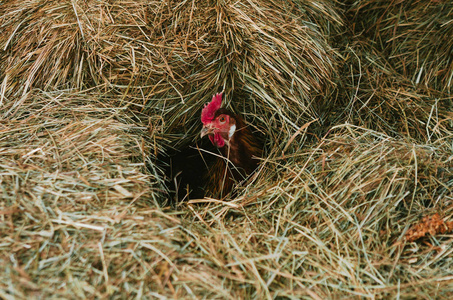 鸡在干草堆里孵蛋照片