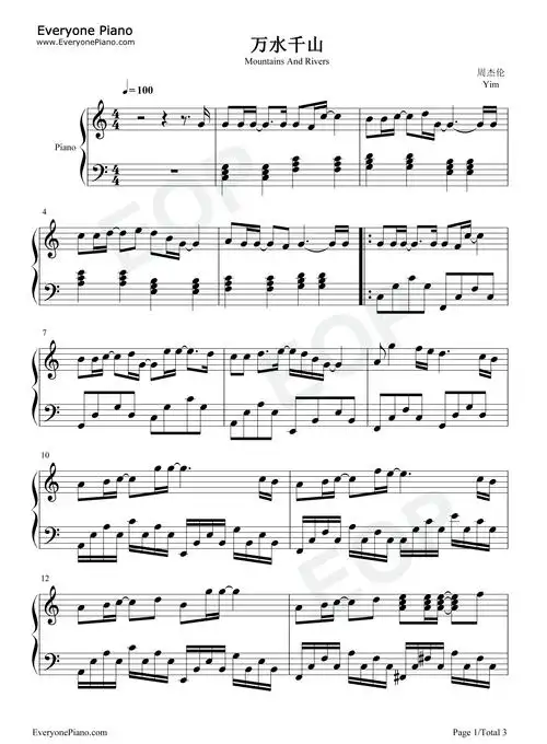 周杰伦《千山万水》钢琴谱 - 钢琴五线谱第1张