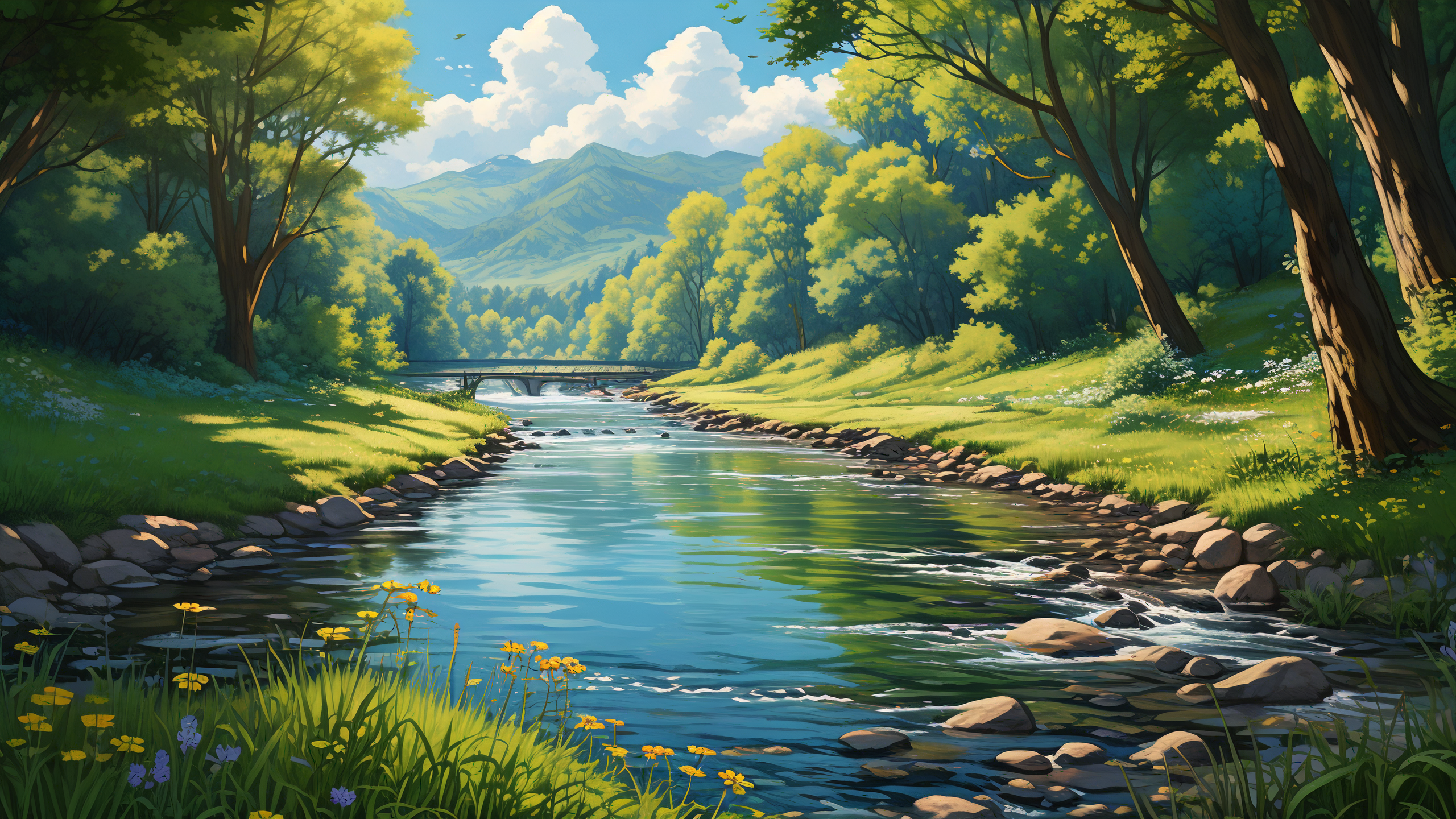沿着清澈的小河漫步,潺潺水声伴随着鱼虾的欢快游动,仿佛在诉说着大