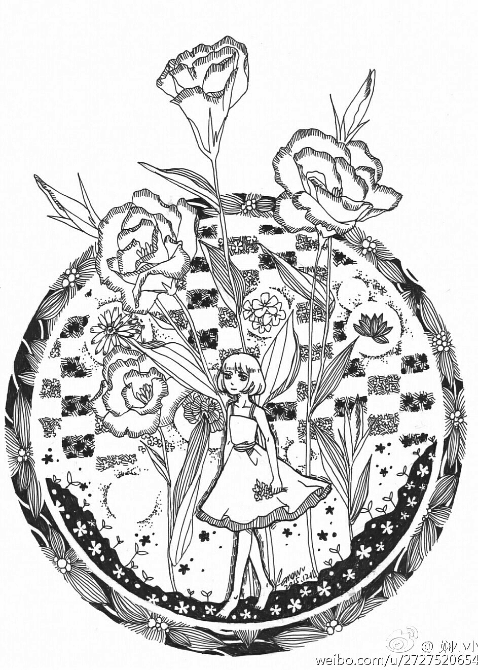 花朵里的躲猫猫黑白针管笔画周末减压