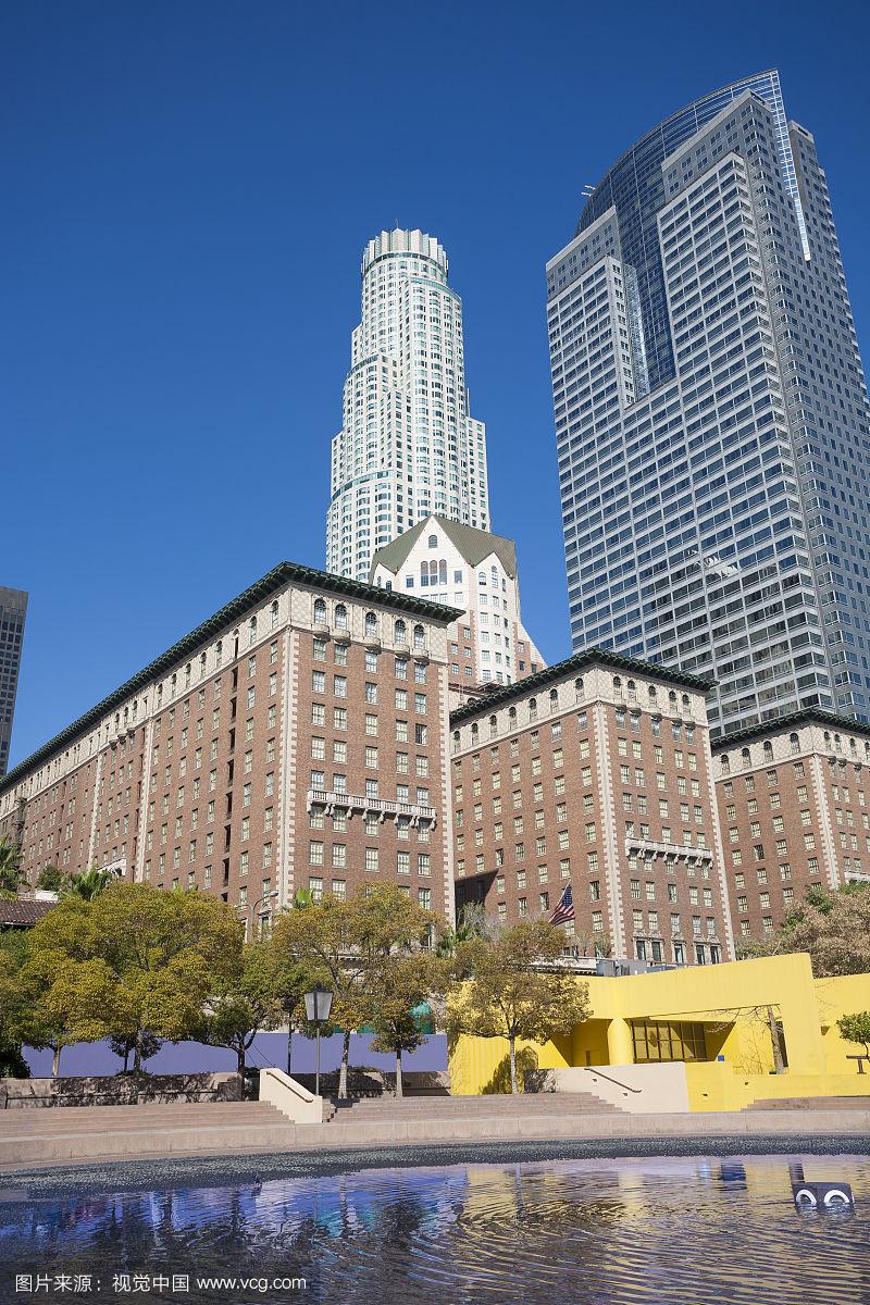 阳光明媚的一天,洛杉矶市中心摩天大楼的天际线