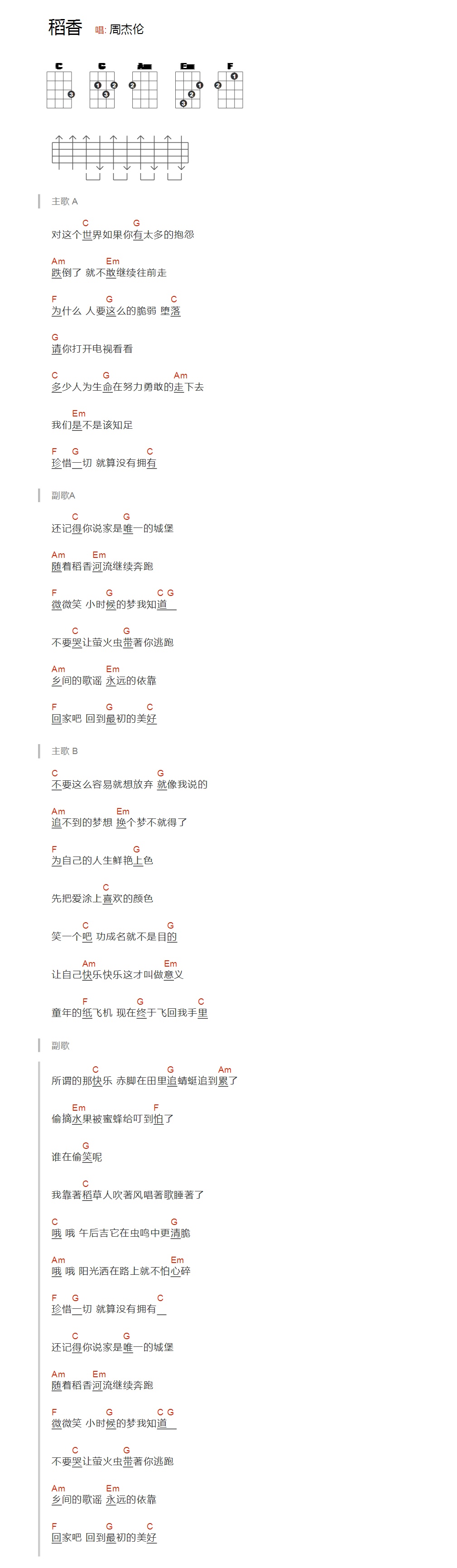扫弦版 周杰伦《稻香》尤克里里弹唱谱