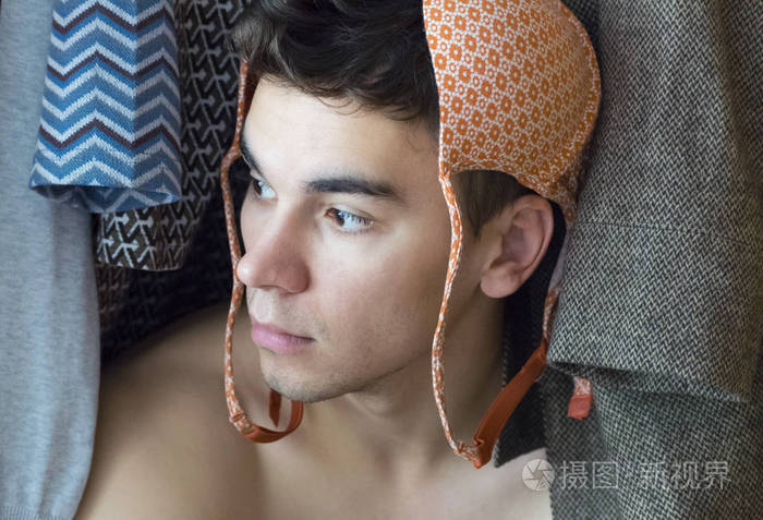 一个戴着胸罩的年轻人藏在壁橱里
