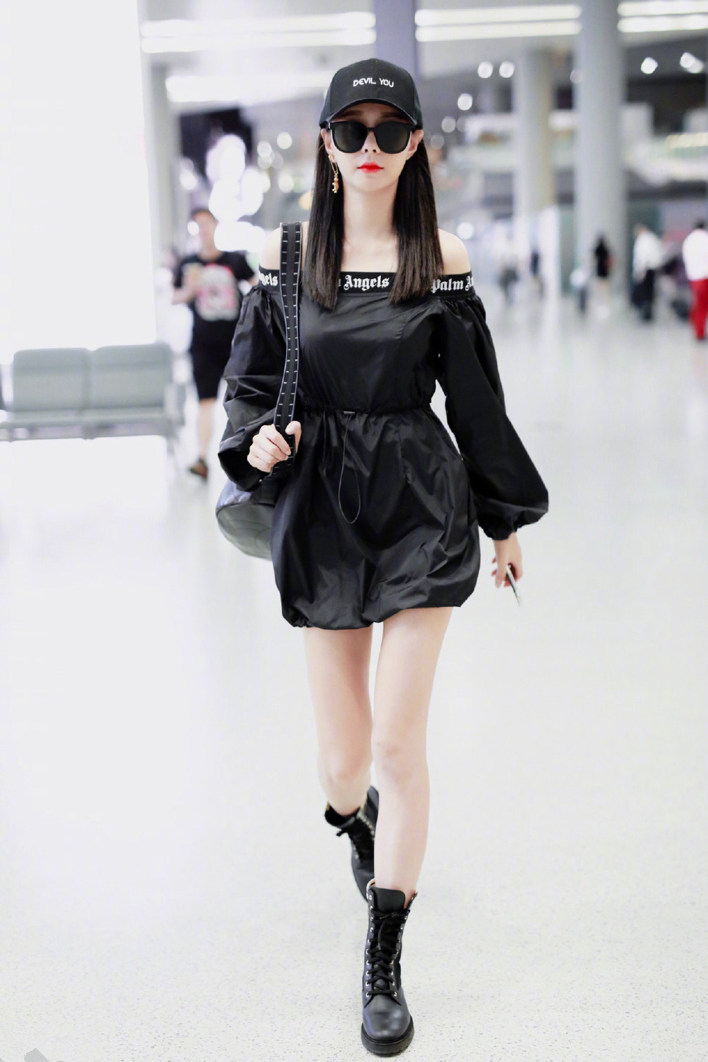 郑爽的机场街拍 身穿黑色上衣配牛仔裤 清新甜美