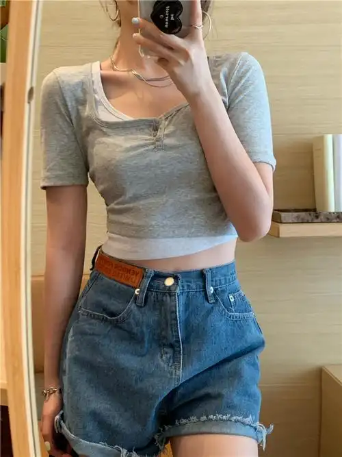 实拍实价 夏季新款个性假两件t修身露脐方领短款上衣女