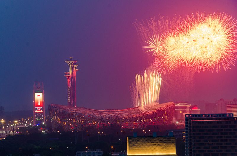 北京鸟巢上空焰火盛放喜迎建党100周年