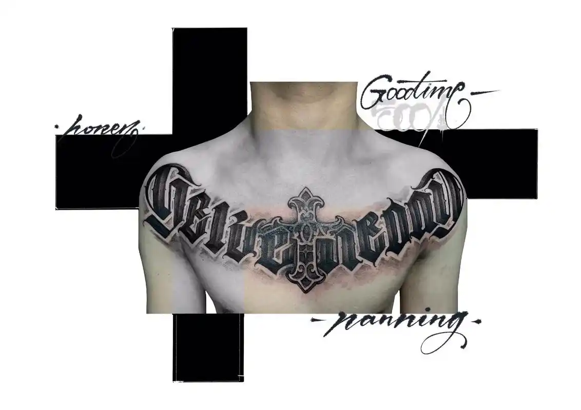 胸口花体字77十字架遮盖 #南宁花体字 #孤探刺青 #字体设 - 抖音