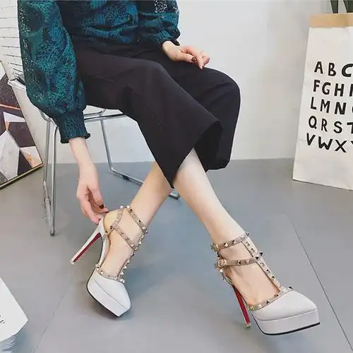 铆钉防水台性感小码高跟婚鞋女尖头12cm细跟百搭罗马包头凉鞋女夏