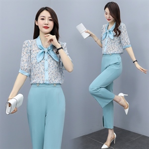 2230两件套碎花短袖t恤 长裤t夏季新款雪纺套装围巾领套装女,套装
