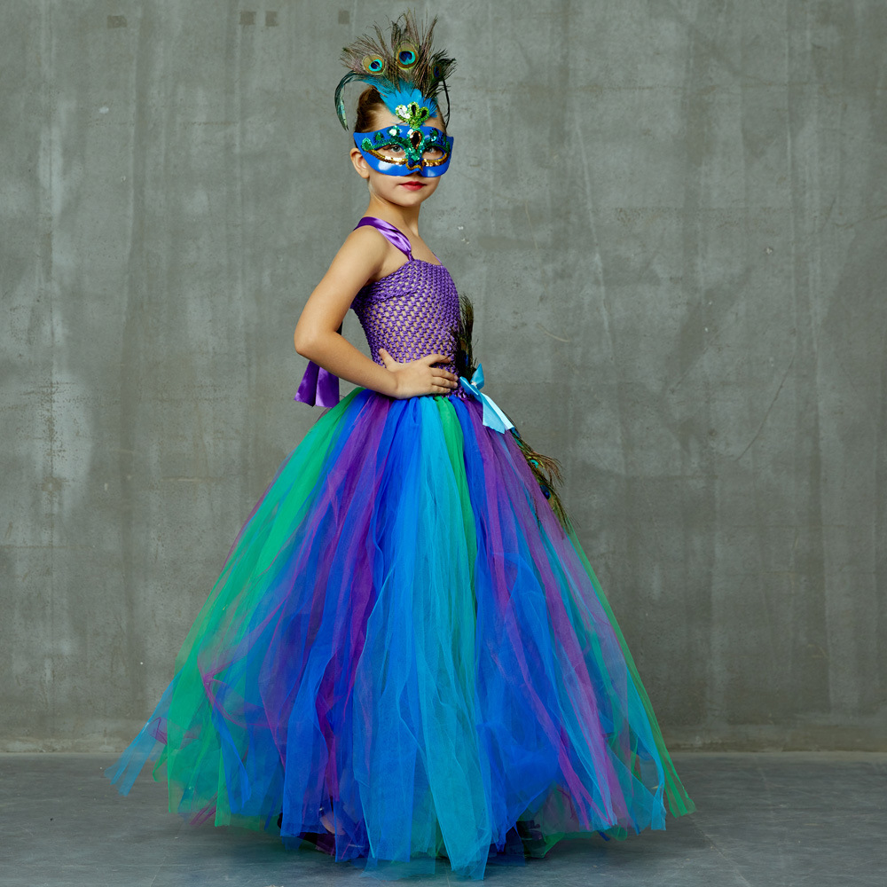 欧美优雅孔雀公主裙女童网纱蓬蓬连衣裙节日派对孔雀翎礼服批发
