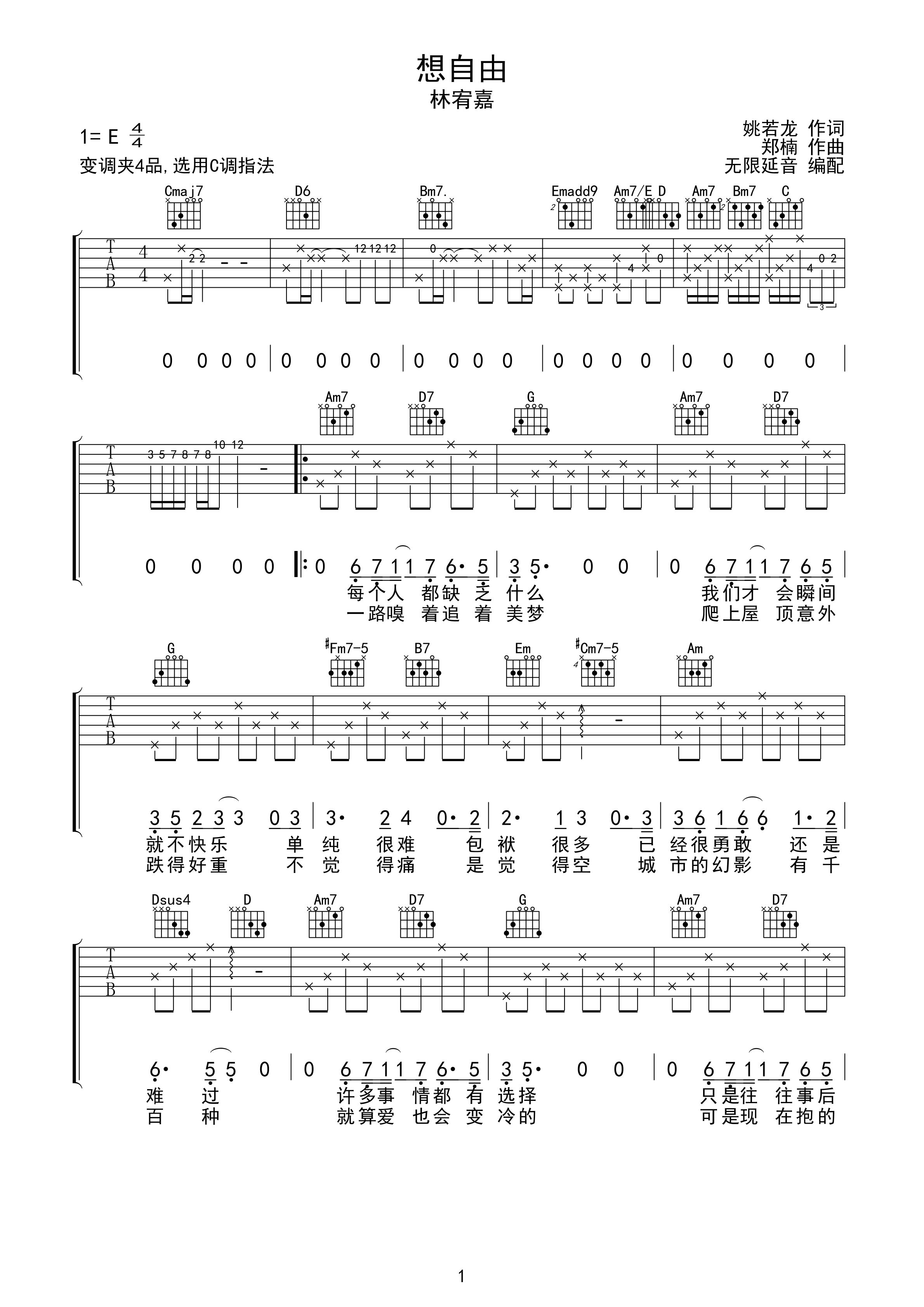 林宥嘉 想自由 吉他谱 c调指法e调六线吉他谱-虫虫吉他谱免费下载