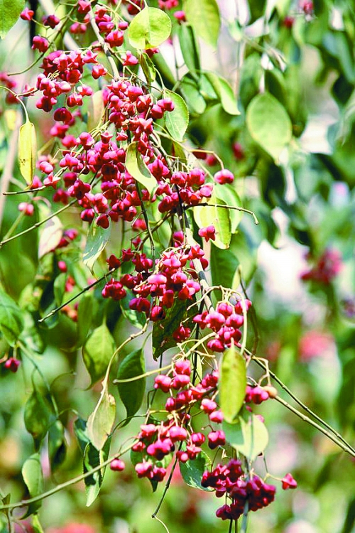 绿城广场上的丝绵木果,果实有突出的四棱角,在树上悬挂长达两个月之久