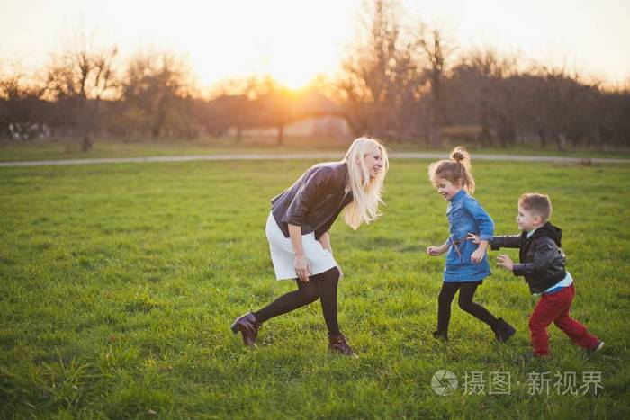 多色的母亲非都市风光妈妈带着两个孩子在草地上快乐玩耍