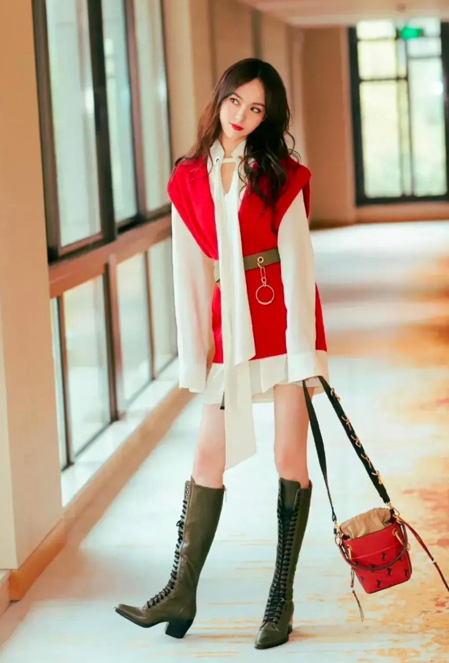 唐嫣这身红白短裙搭配长筒靴,个性时尚,青春靓丽,优雅大气又不失甜美!