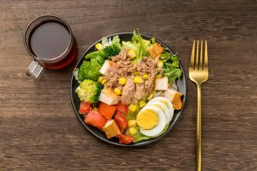 一盘金枪鱼蔬菜沙拉西餐菜品特写