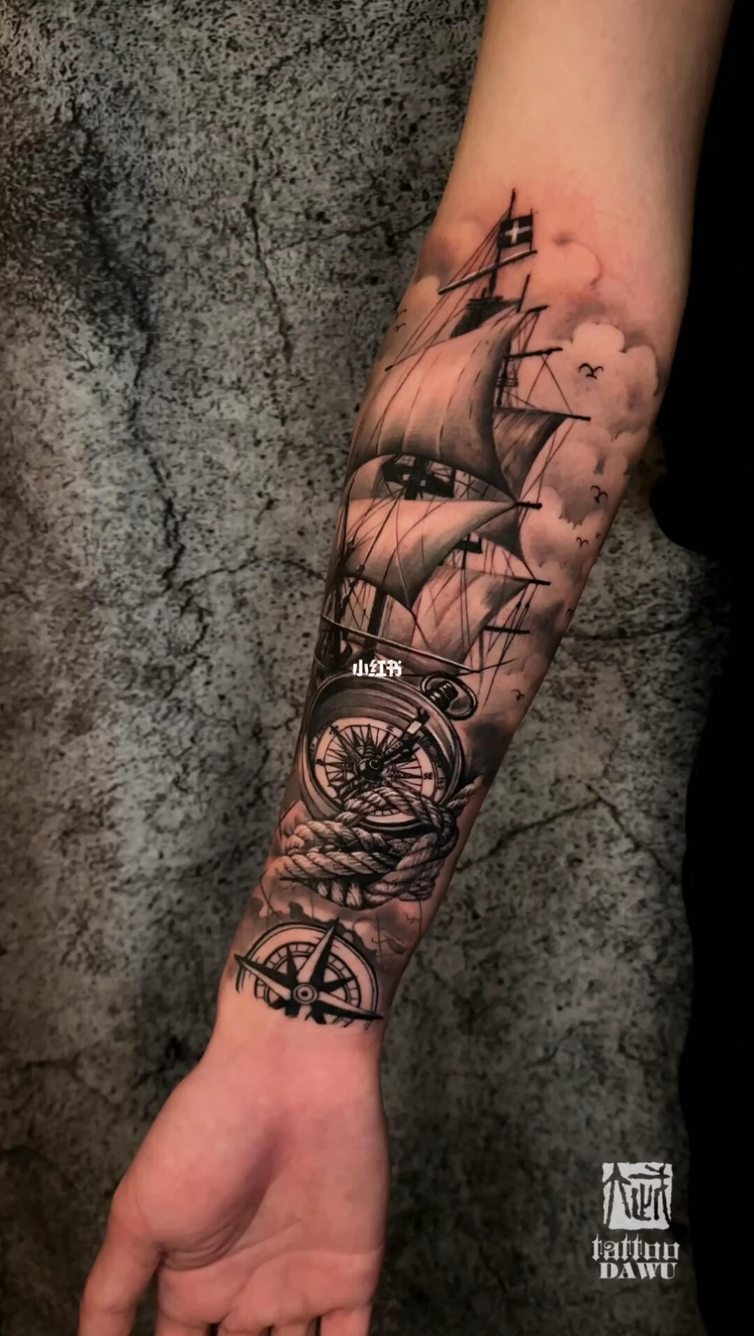 小臂指南针纹身 胳膊小臂上的9款黑灰指南针纹身作品图片