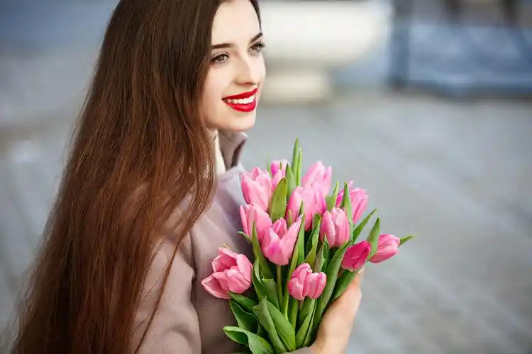 拿着一束红色郁金香的漂亮女人