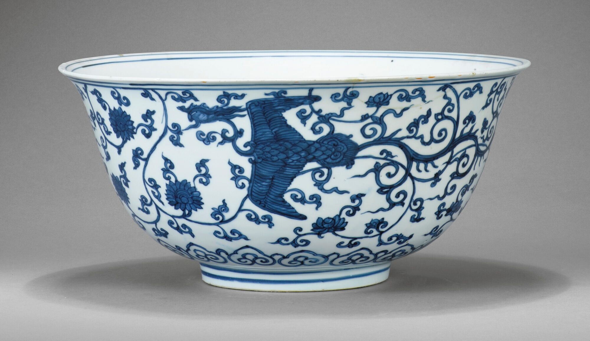 大明成化款青花穿花缠枝莲凤凰纹撇口碗