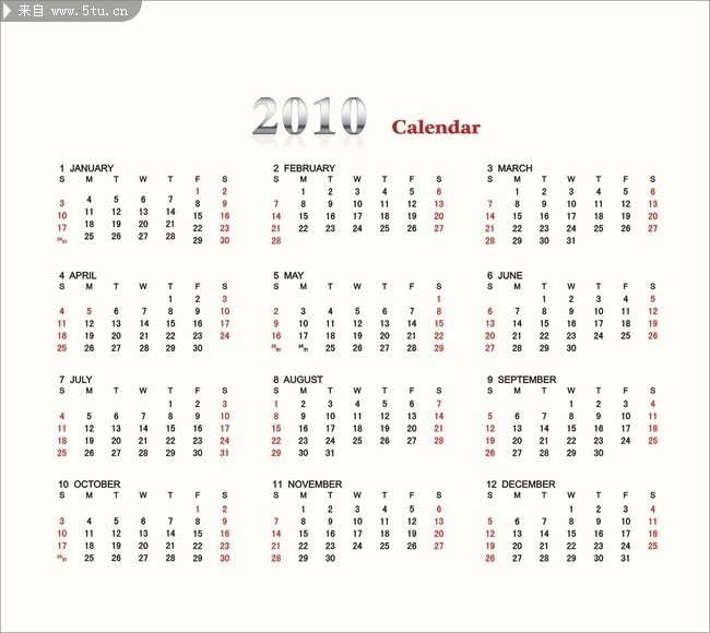 简约2010年年历,主题为国外2010年台历,可用作虎年日历时尚版,日历