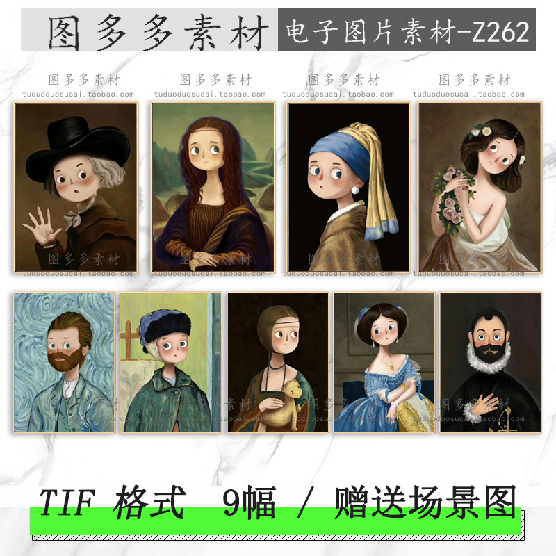 卡通q版世界名画人物蒙娜丽莎梵高个性创意儿童房装饰画素材图片