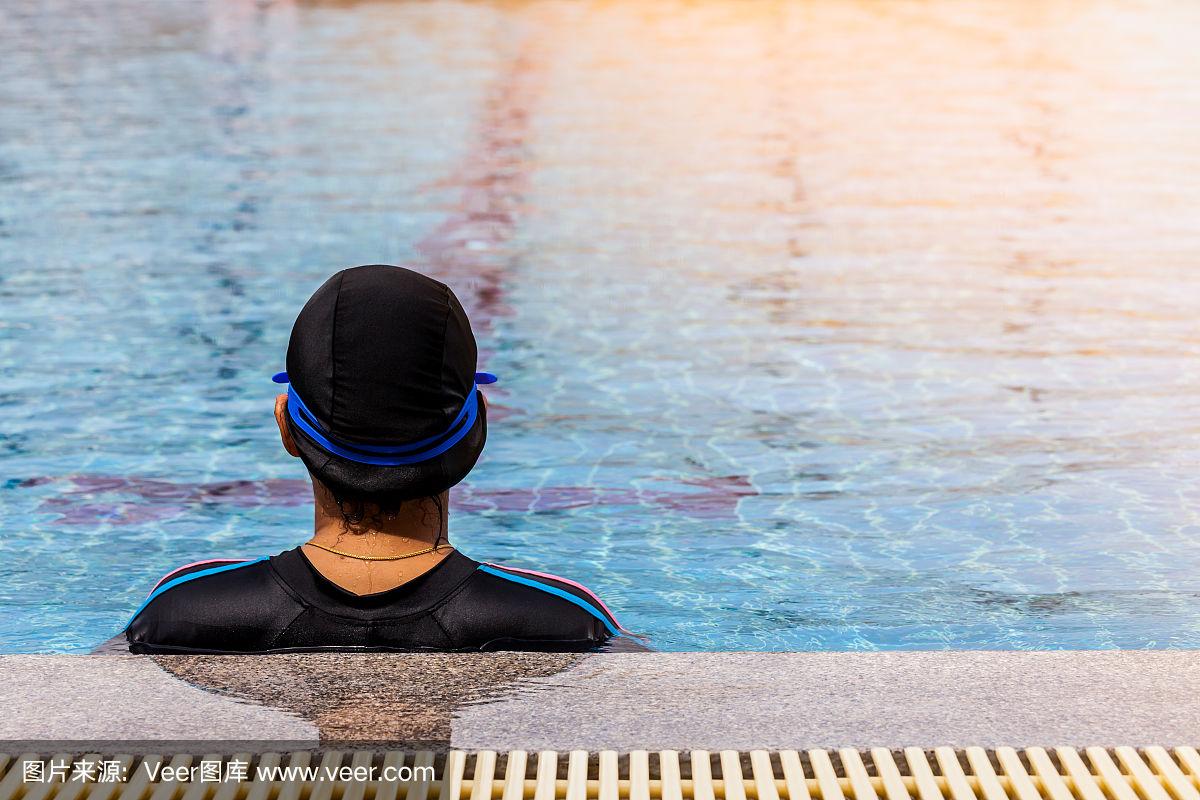 年轻女子游泳运动员的背影站在游泳池里.