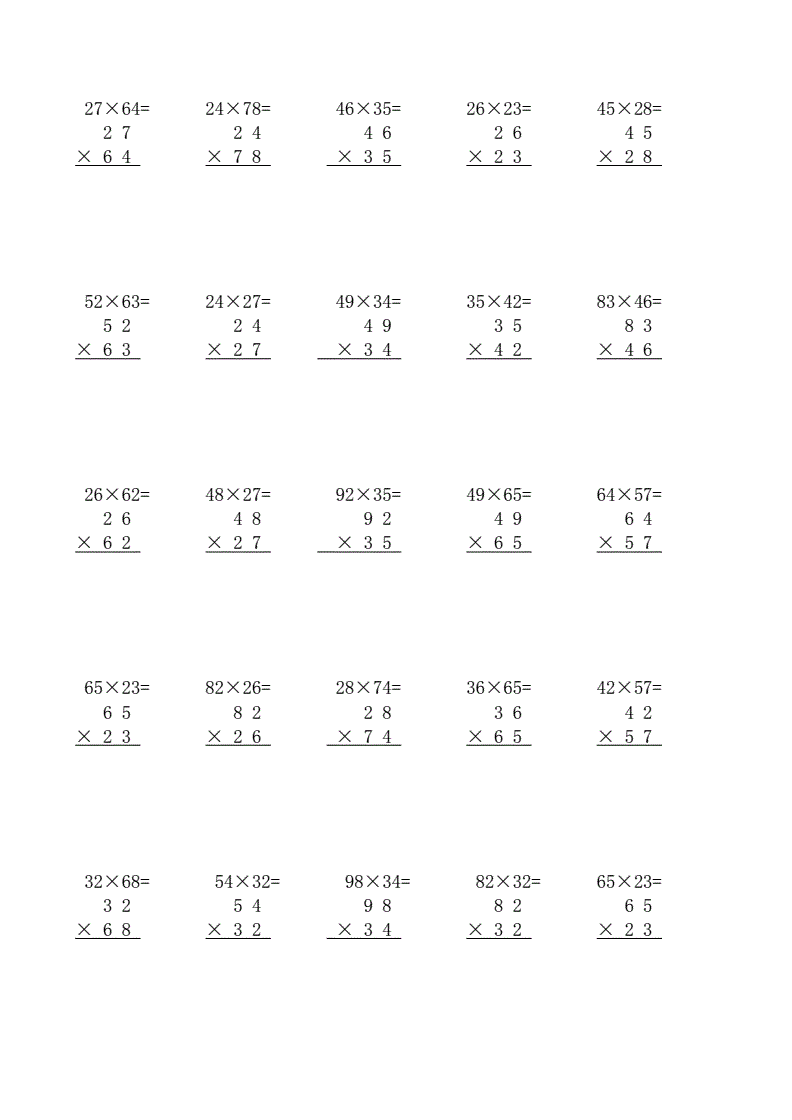 竖式乘法(2位数乘2位数) 竖式乘法,每页25题,共30页.