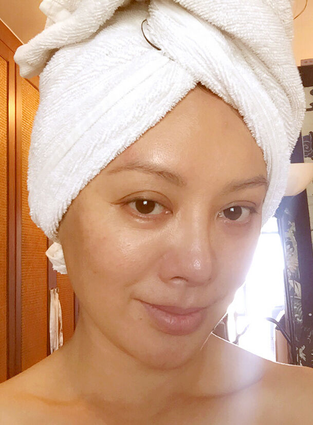 宁静在微博晒出自拍照,照片中宁静头裹浴巾,露出性感锁骨,即使脸上有