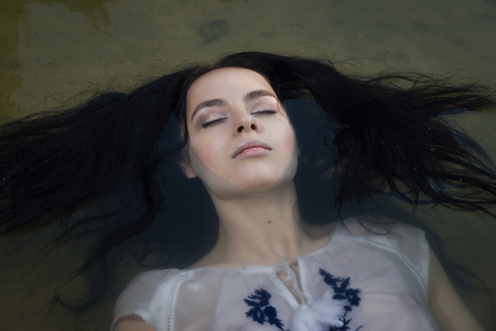 年轻漂亮的溺水女子躺在水里照片