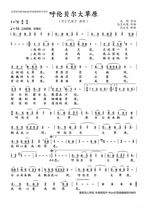 呼伦贝尔大草原简谱(歌词)_布仁巴雅尔演唱_根据演唱mp3记谱