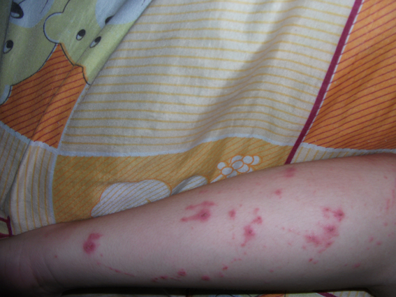 晚上睡觉时不知道是被什么虫子咬了,次日上午才知道,手臂上有好多红包