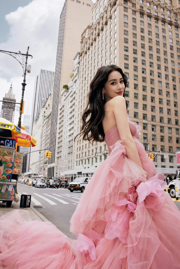angelababy粉色花朵纱裙#angelababy纽约活动造型图,一袭粉色花朵纱