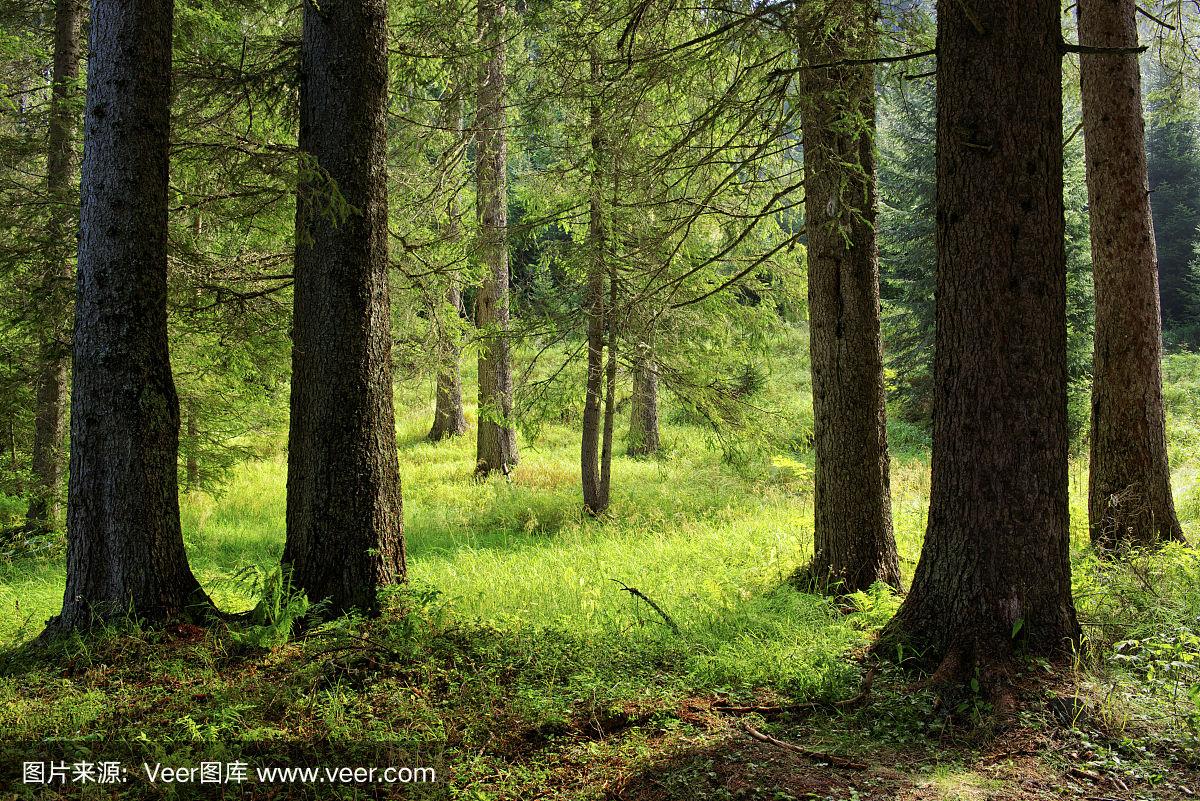 晴朗的早晨在树林里.云杉和松树林照片-正版商用图片02zjt2-摄图新视