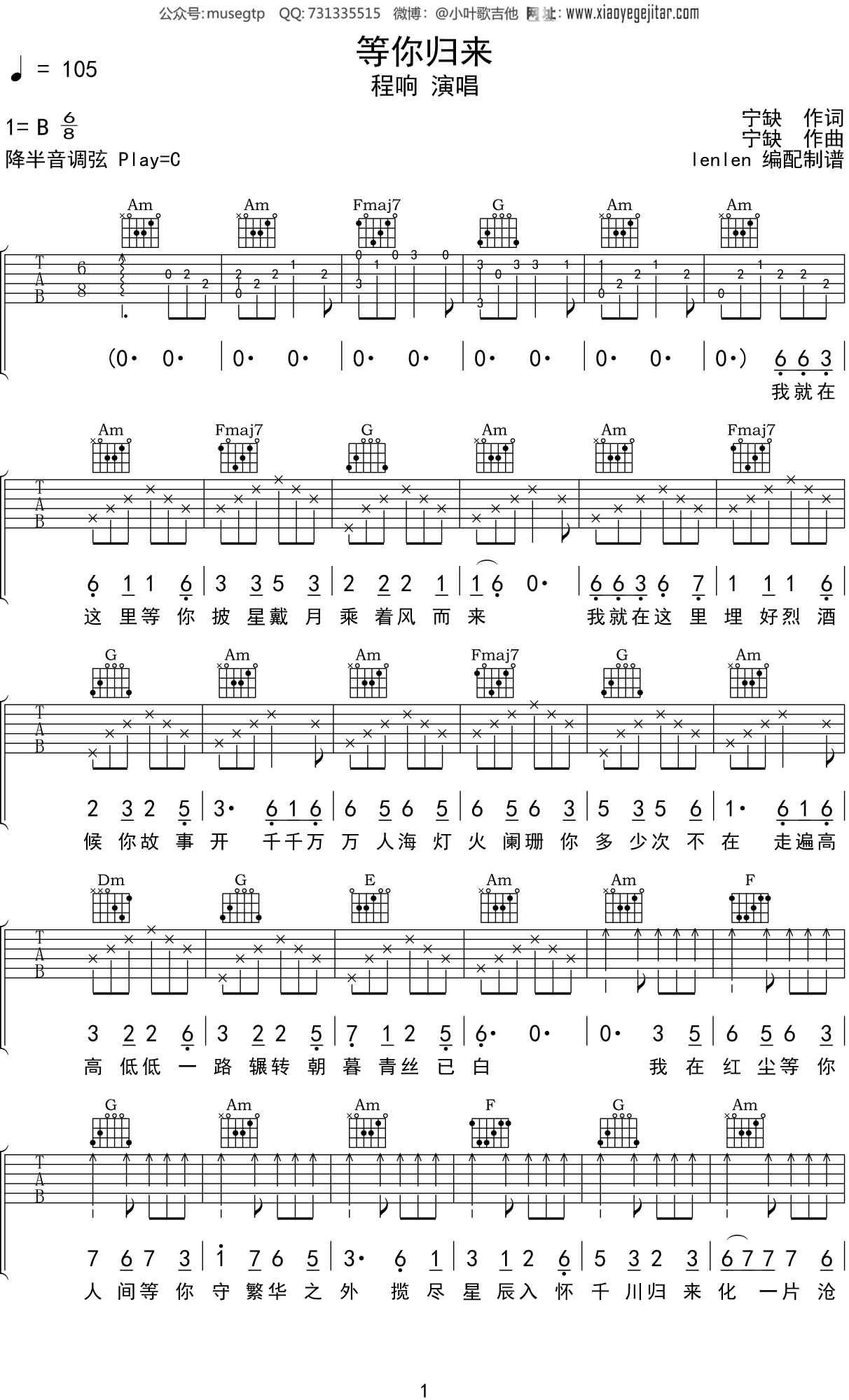 等你归来吉他谱_程响_g调指弹 - 吉他世界