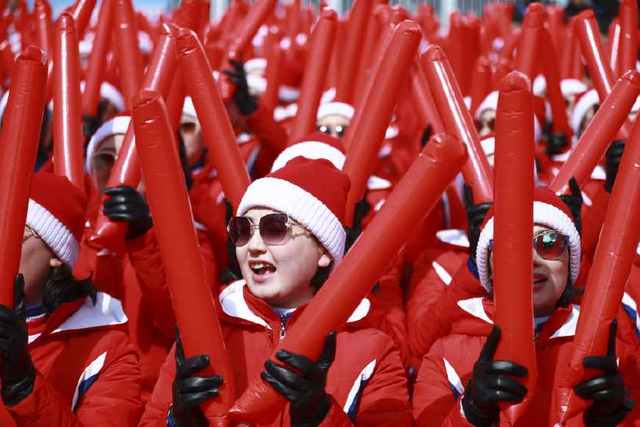 朝鲜拉拉队助阵平昌冬奥会高山滑雪男子回转比赛