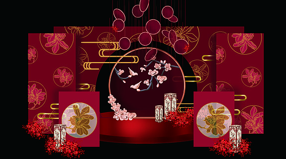 大红红色欧式婚礼背景设计效果图婚庆舞台喷绘样图