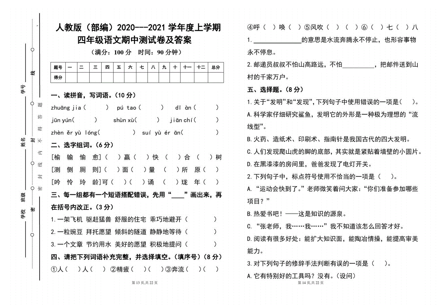 小学考试人教版(部编)2020---2021学年度上学期四年级语文期中测试卷