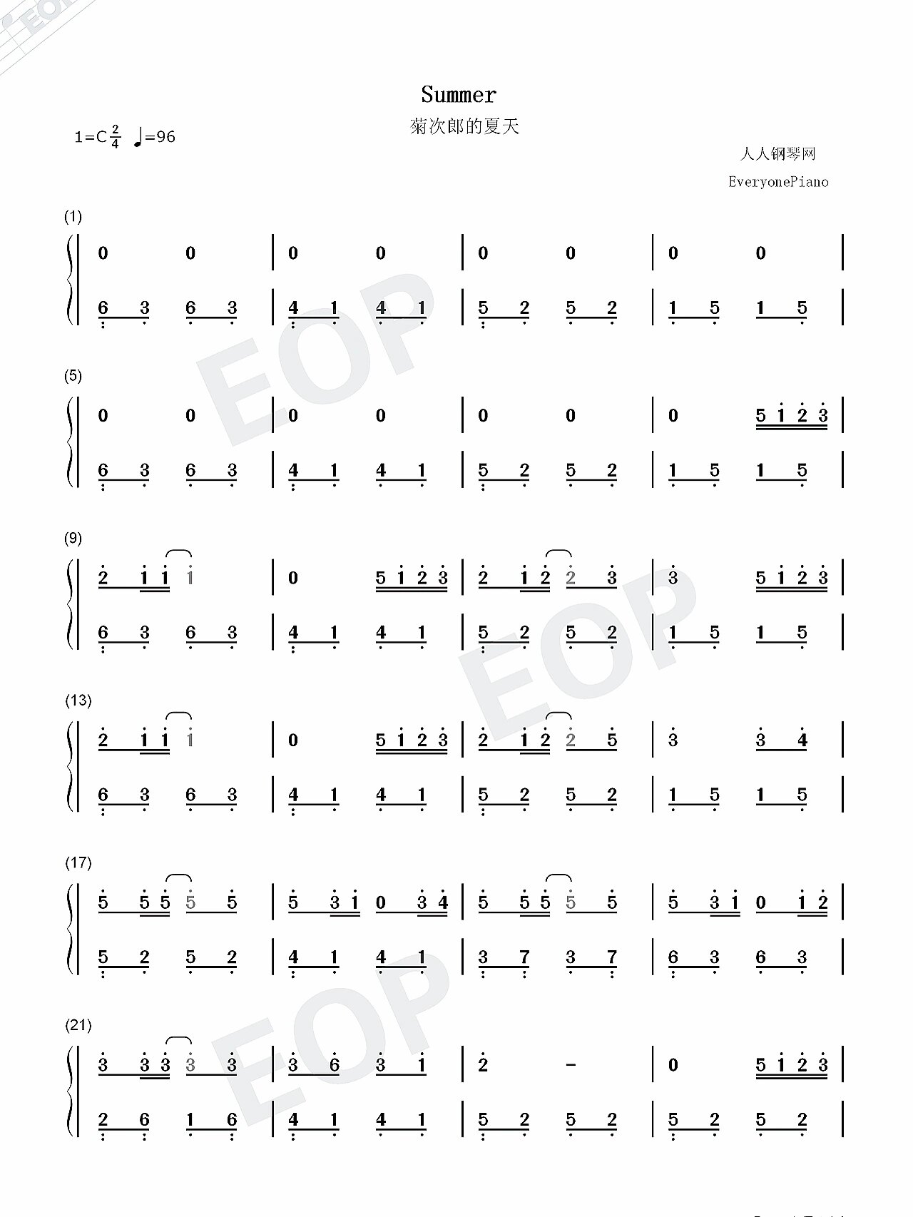 菊次郎的夏天简谱 双手合奏版歌谱-苍强曲谱