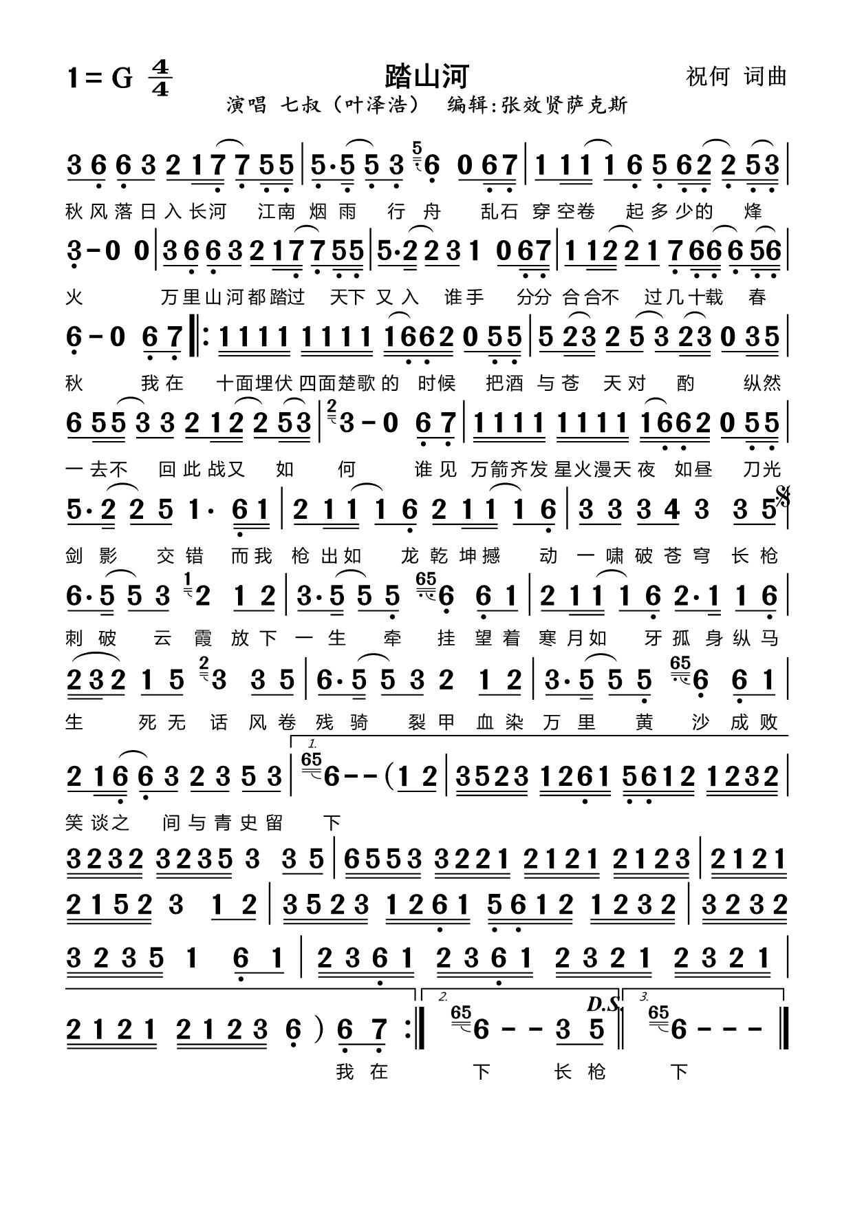 歌曲简谱是七叔呢踏山河免费高清歌谱简谱流行弹唱网