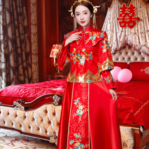 2020新款长款新娘礼服敬酒服结婚裙子套袍红色龙凤刺绣